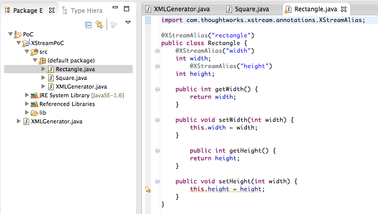 8) Go back to the Standard way to serialize and deserialize Objects with XStream page, and do the same thing for the Square.java and Rectangle.java files